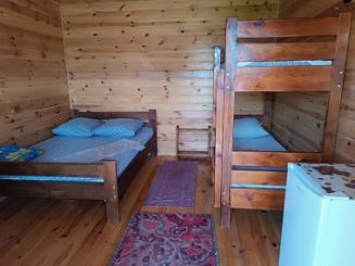 В малому будиночку нагорі є чотири 3-ри місні кімнати, в кожній двоспальне та односпальні ліжка, вішак, столик, чайник з чашками, телевізор Т2 і Wi-Fi. На поверсі санвузол спільний.